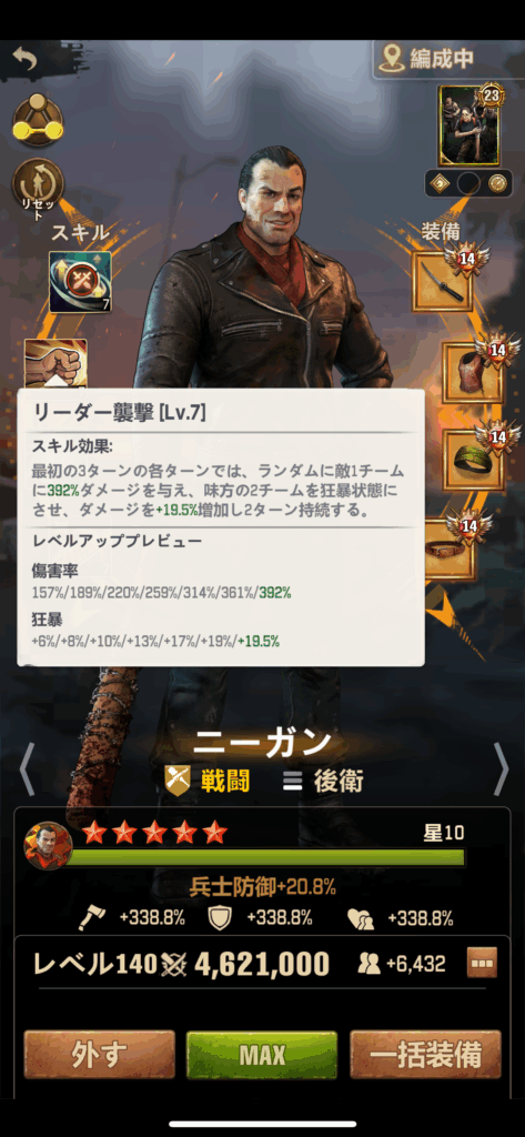 まあ〜だったら暴力主義で総督・武装ドワイト・ニーガンを使えばいいんじゃないのー?って思う方も多いと思います。確かに使ってはいますが、戦士や狙撃に比べたら馬🐴弱いんですよ。あれで馬🐴使うんだったら、いっそのこと戦士や狙撃使ったら?ってなっちゃうので、さすがにそれは悔しいなあーとwwww
