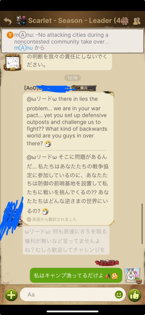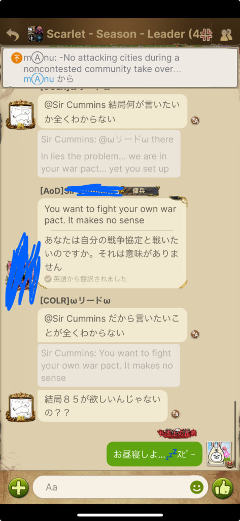 敵さん(同陣営)は戦争協定、戦争協定とS5のときのバルキリーみたいに連呼していますが、「95%は我々が戦っていた」とか「23は戦っていない」とか、あげくの果てにしれっとC85の占有を宣言してないのに関わらず、速攻で囲んでガチで取りにくる態度。
