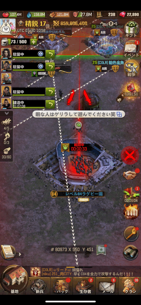 C85エリア開放して23時間が経過しました。23は戦っていないと言ったクランAoDを主犯とするサーバー26と265は、C85に飛ばした要塞を我々23にマッハで破壊され、1日も経たず降伏しました。