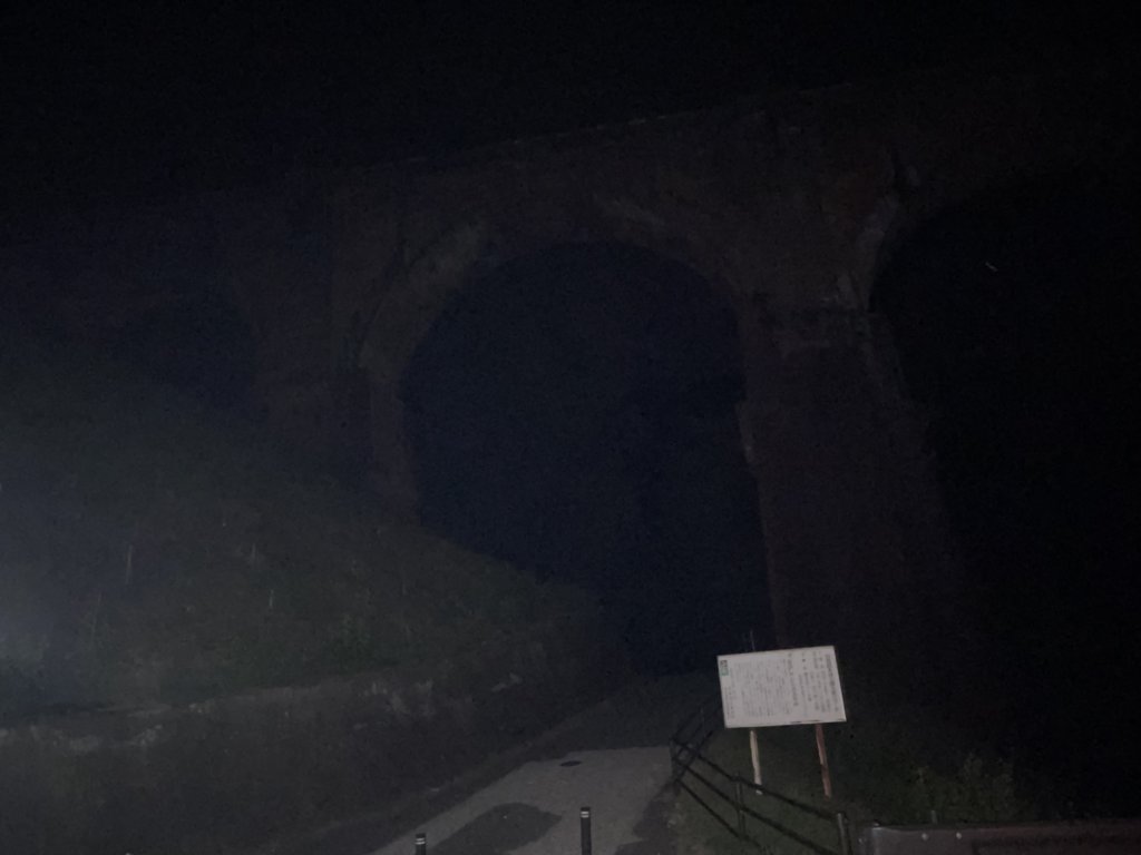 んで、メガネ橋ですがやばすぎて夜はこれ以上奥へ進めませんでした。怖すぎる。まず山の中なので暗い。ライトがなければ完全な漆黒の闇であり、超絶静かで無音。周囲は毎日熊🐻さんが出るらしく、夜に軽装で娘といけるような場所ではなかった。。。